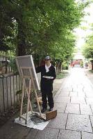 多くの学生・教職員の通学通勤路となっている車折神社で制作している I 君。